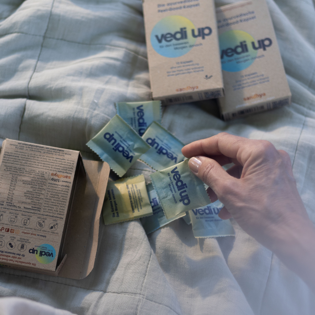 vedi up – Deine Unterstützung für anspruchsvolle Situationen. Die Bitterstoff-Formel basiert auf uraltem Ayurveda-Wissen und hilft dir, Balance zu bewahren – am besten direkt zum Genussmoment einnehmen.